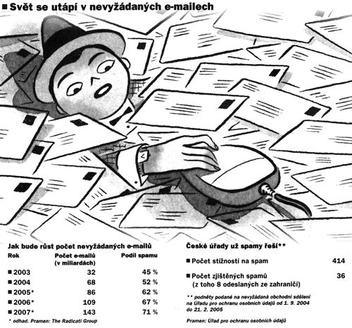 Češi se však mohou proti těm, kteří nevyžádanou poštu rozesílají, bránit. Loni na podzim začal platiti zákon, který přesunul možnost ukládat pokuty za nevyžádaná obchodní sdělení na Úřad pro ochranu osobních údajů. Zákon však nepostihuje ty, kdo e-mail zneužívají k rozesílání politické či náboženské reklamy. "Celkový počet stížností, které obdržel úřad k 21. únoru 2005, dosáhl 414. Úřad tyto stížnosti prošetřuje", sdělil v on-line rozhovoru serveru Technet.cz předseda úřadu Karel Neuwirt. "V České republice spammeři nebudou trestáni soudem, ale úřad jim může udělit správní sankci, která může dosáhnout výše 10 milionů korun", řekl předseda o způsobu postihu. Zatím však žádný případ do této fáze nedospěl.