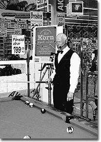 Kdo porazí Jirku Korna, to bylo moto exhibiční akce v Hradci Králové. Jirka Korn zde neúnavně hrál plných sedm hodin proti náhodným hráčům z řad zákazníků TESCA. Hrálo se na devítistopém stole firmy HELTA, Profi Pride, na kterém se hrála i obě ME v letošním roce. Jeho hra a hlavně živý zpěv, byly přerušeny pouze dvěma trikšotovými výstupy Dominika a Pavla Halamky. Každý výstup trval okolo 40 minut, ale Jirka Korn neodpočíval. Zúčastnil se aktivně i obou exhibic. Nakupujících v TESCU bylo požehnaně, a tak můžeme napsat, že to byla asi největší exhibice u nás, za účasti asi největšího počtu diváků. Jak jsme již napsali, Jirka Korn i zpíva. Zpíval od starších písniček po nejnovější hity. Zpíval živě na hudbu z minidisku a hrál. Hrál tak dobře, že jej porazily pouze tři ženy a kdo Jirku zná, ví, že tyto prohry byly jeho galantním gestem. Vítězky obdržely od zástupců TESCA trička a vyhrály i zdarma předplatné našeho časopisu. Navíc dostaly poukázku na nákup zdarma v hodnotě 50,- Kč. O tyto poukázky zákazníci bojovali i jinak. Do prostředka stolu byla umístěna barevná koule a jakýkoli zákazník si mohl postavit bílou kouli na rozstřelovou čáru. Pak zkusili zahrát kouli do určené díry. Nebyl však nikdo, komu by se to podařilo, neúspěšného vákua a rozčarování přítomných využila Růženka Halamková, která rovněž vystupovala na exhibici.